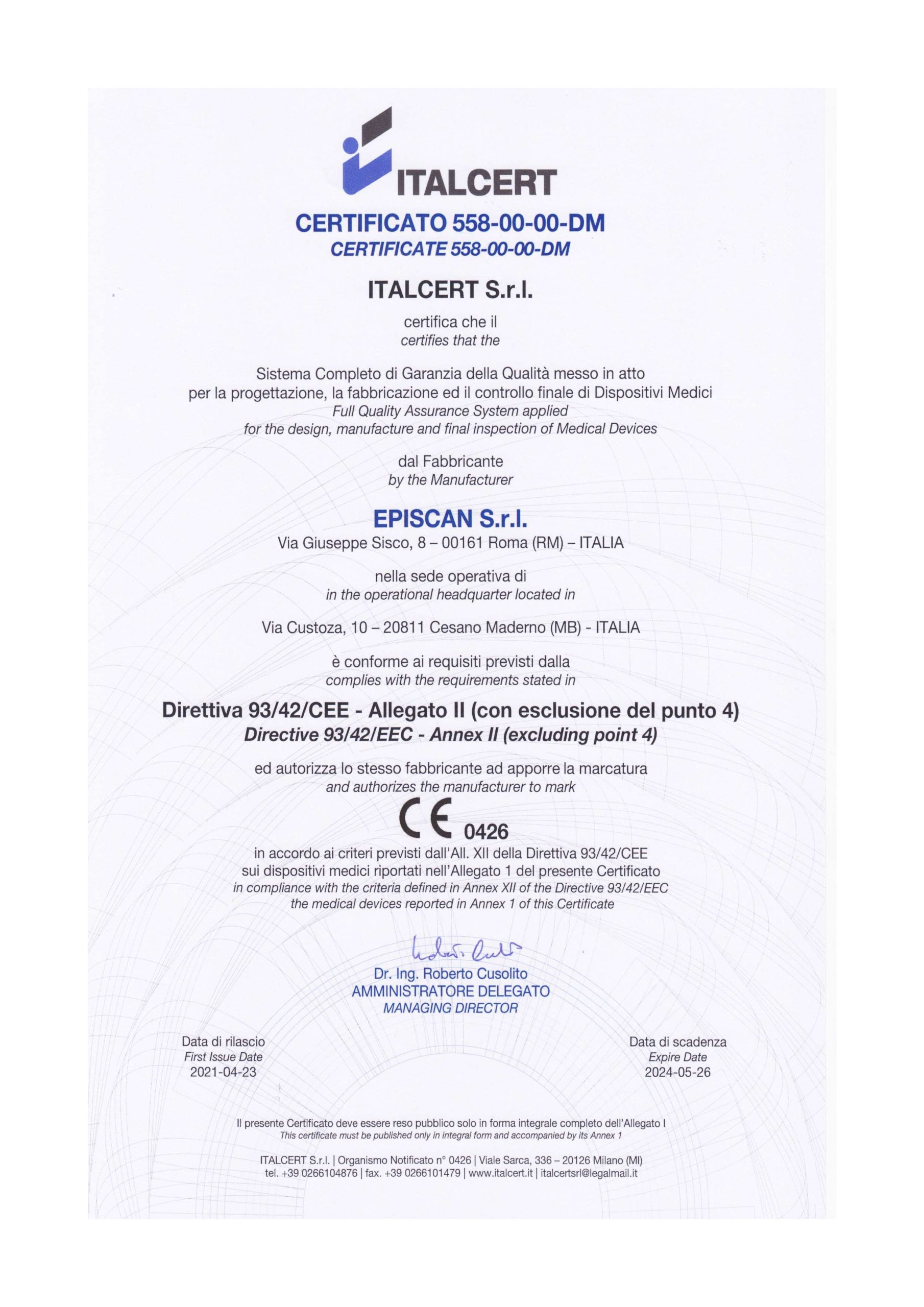 Episcan srl è in possesso dei certificati CE di approvazione del Sistema Completo di Garanzia della Qualità. Italcert dichiara di aver effettuato l’esame di tale Sistema seguendo i requisiti della legislazione cui essa è soggetta, come da Allegato II (con esclusione del punto 4) della Direttiva 93/42/CEE sui Dispositivi Medici. I dispositivi certificati appartenenti alla Linea Episurgical, Episurgical Micro, ed alla Linea Epifix sono: Viti, Placche, Chiodi, Cambre, Fili, Frese per traumatologia, Fissatori esterni.